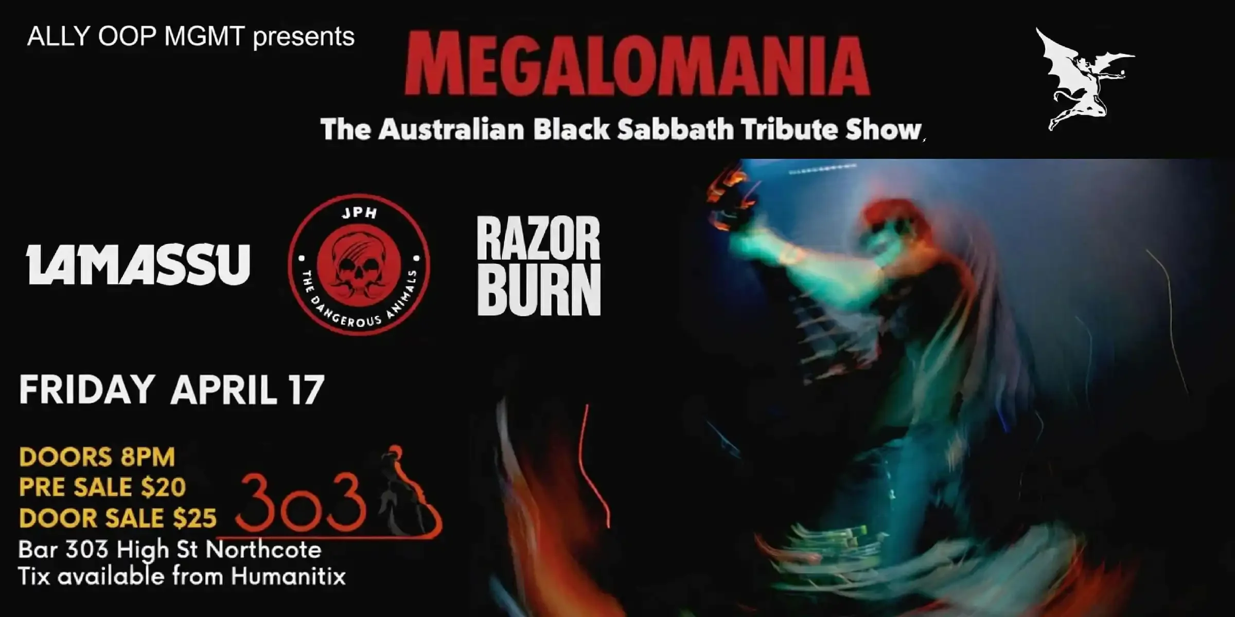 ALLY OOP MGMT presents Megalomania The Australian Black Sabbath Tribute Show. Rocking Melbourne originally since 2023. Most recently delivering shows at The Graveyard and Wheat wine and whisky bar. They are ready to rock Bar 303 with all your fave Black Sabbath catalogue songs from 1970-1978. Songs include Paranoid War Pigs and Into the void, taking you back in a time warp. Led by Stuart ‘Ozzy ‘Mander Melbourne’s own Prince of Darkness , it is as close as you will get to the British spirit from Birmingham. With our ‘Geezer’ Aaron ‘Traffy’ Trafford, Italian powerhouse drummer Fabry and guest Riffmaster TBC!