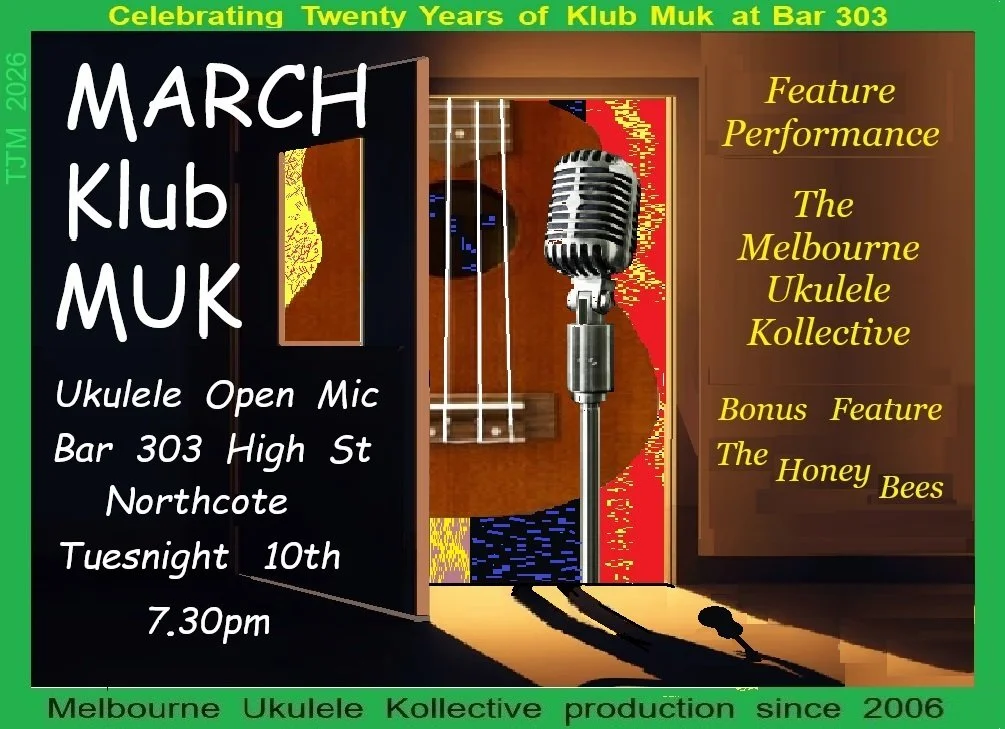 Klub MUK is an Open Uke Stage the second Tuesday of each month at 303. Hosted by the Melbourne Ukulele Kollective (M.U.K.) an open-armed gaggle of ukers of all ages and persuasions, each equipped with only four strings and the truth! With small egos and big dreams, they're on a crusade to bring the greatest glory to the humblest of instruments and put music back into the hands and hearts of the people.